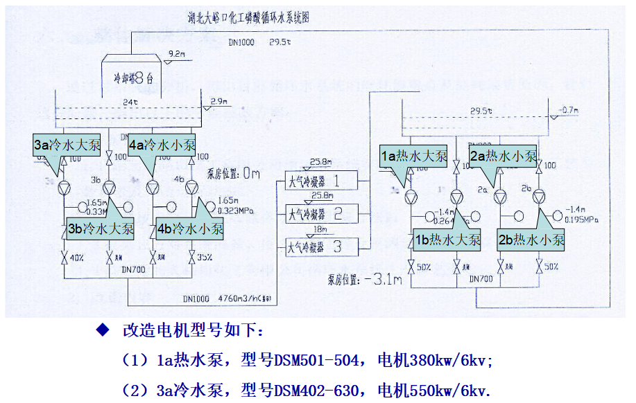 二、大峪口公司積極響應(yīng)國家節(jié)能減排號召,針對其磷酸車間循環(huán)水系統(tǒng)進行節(jié)能改造,前后有多家公司提出了改造方案。將原有泵更換成高性能泵,提高水泵效率,并對其管道系統(tǒng)進行改造,其中2家節(jié)能公司提出通過節(jié)能泵對該系統(tǒng)進行改造。